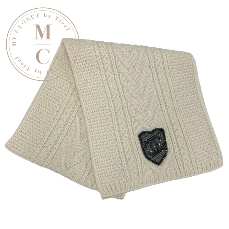シャネル CHANEL マフラー カシミヤ ホワイト ココマーク ワッペン ラインストーン チェーン