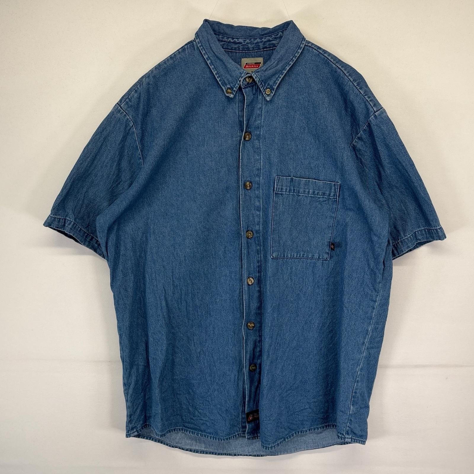 古着 ディッキーズ Dickies 半袖シャツ デニムシャツ 胸ポケット ボタンダウン ワンポイントロゴ L ブルー系 メンズ