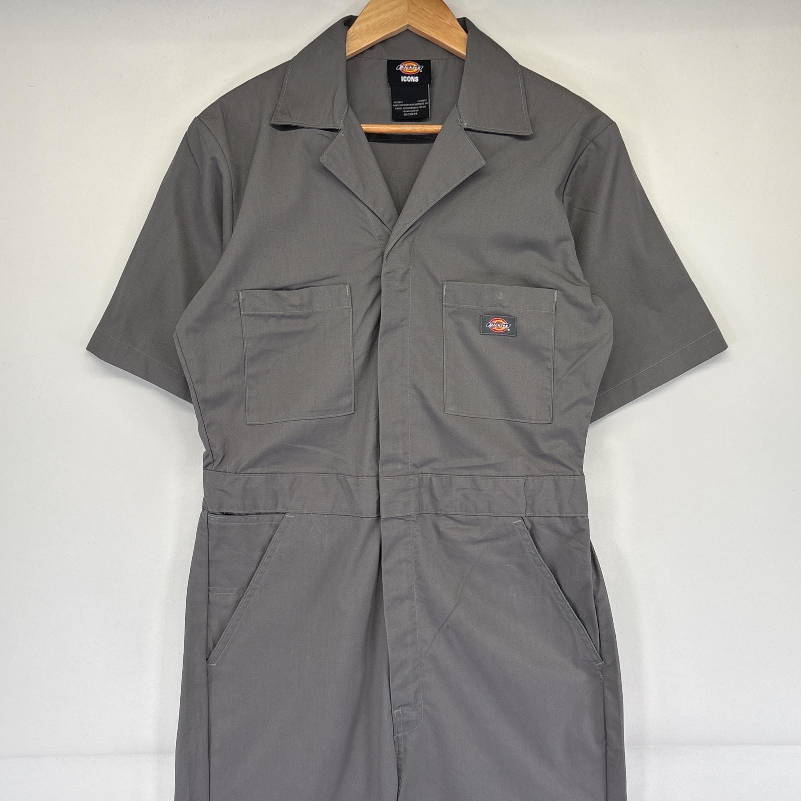 古着 ディッキーズ Dickies 半袖つなぎ オールインワン ワーク 作業着 ワンポイントロゴ 胸ポケット SR グレー メンズ