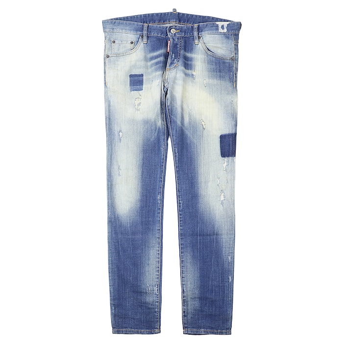 【SALE】DSQUARED2 ディースクエアード デニムパンツ リメイク ユーズド&ダメージ加工 シグネチャー ロゴ レザーパッチ ボタンフライ スリムストレート ストレッチ ジーンズ ボトムス メンズ サイズ 48 ライトインディゴ イタリア製