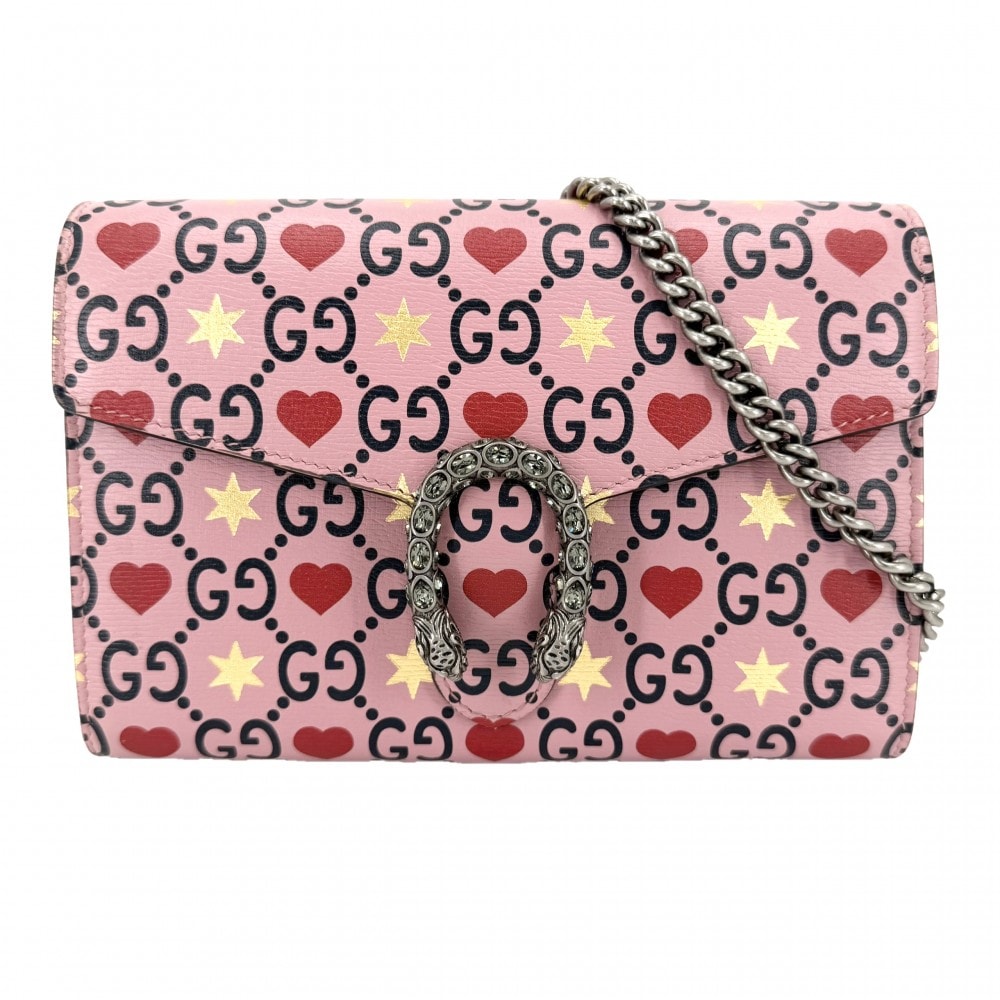 GUCCI グッチ ショルダーバッグ ディオニュソス タイガーヘッド ハート 肩掛け 斜め掛け チェーンショルダー スター 401231 レザー ピンク レッド 赤 シルバー金具 レディース 美品【中古品】