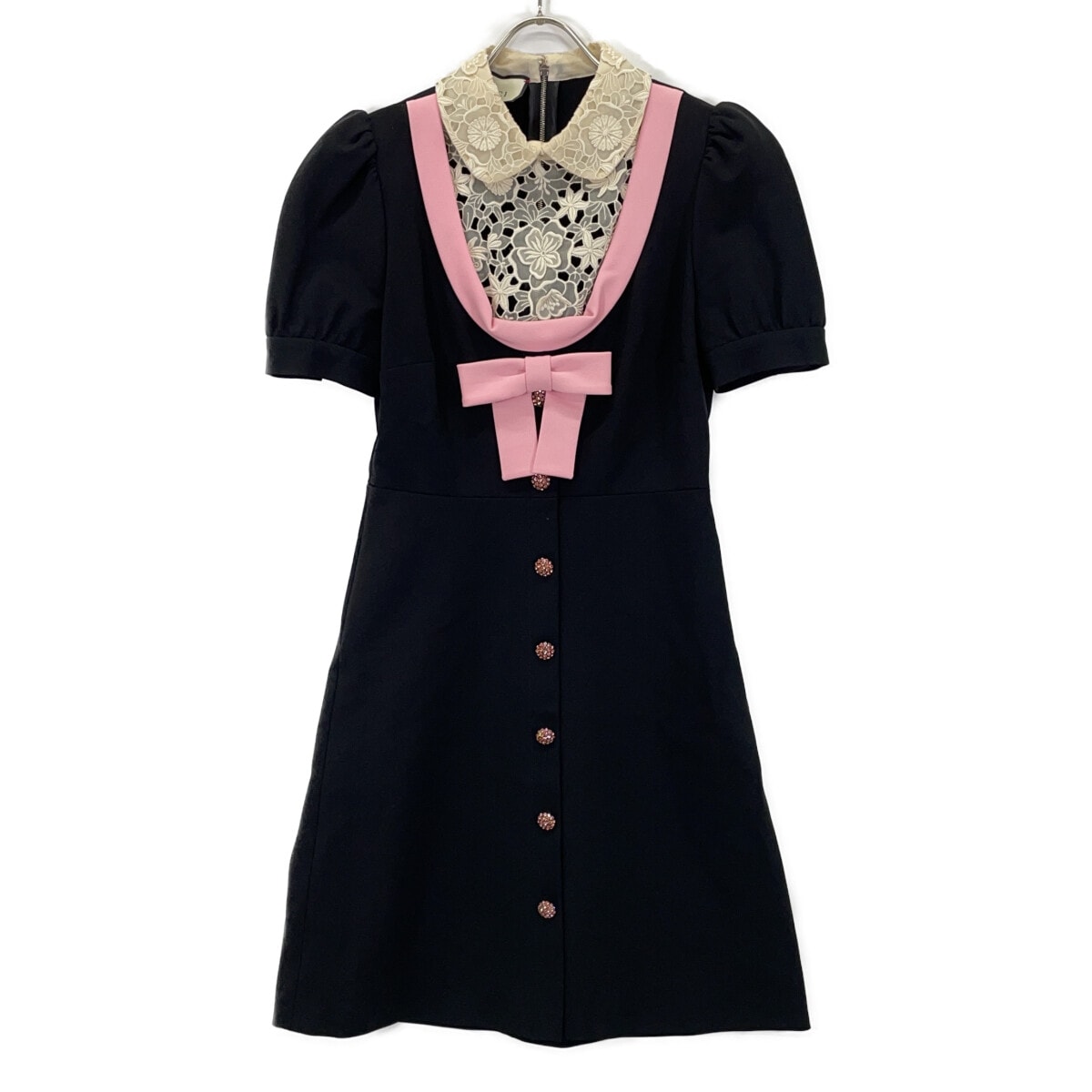 グッチ 467502 ブラック×ピンク エンブロイダリーレースカラーリボンデザイン半袖ワンピース S