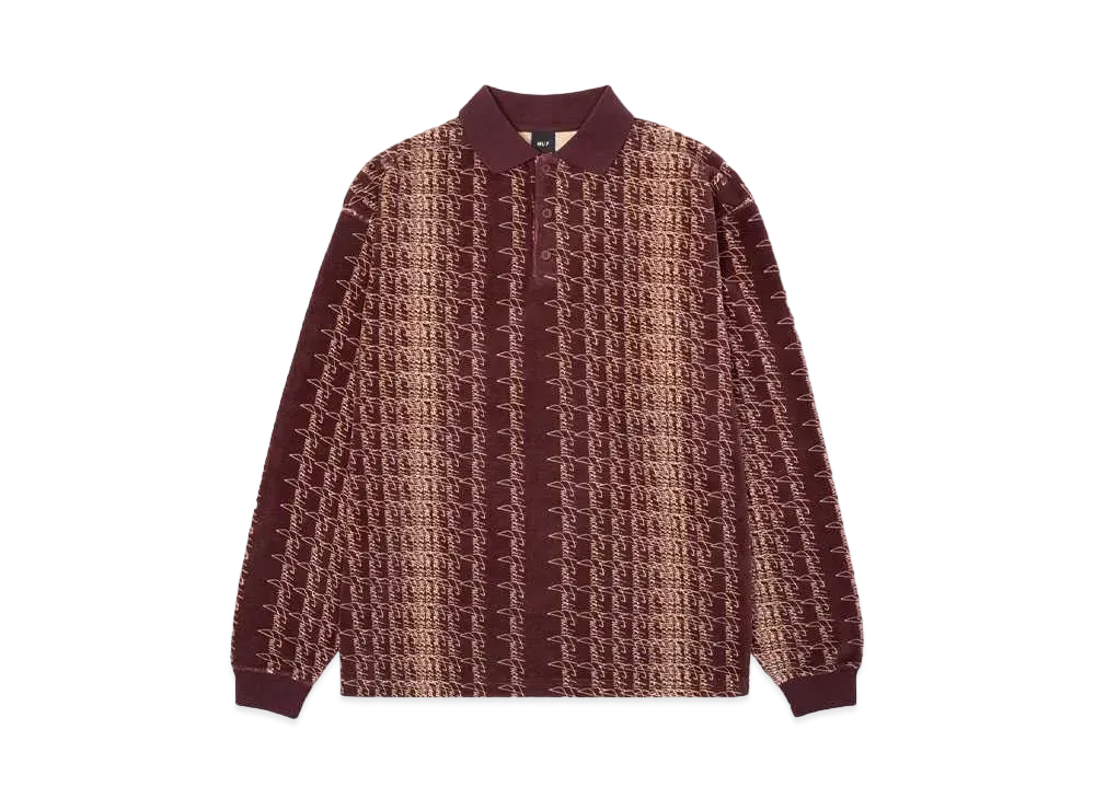 HUF Fall 24 Script Stripe Velor Long Sleeve Polo "Mahogany"