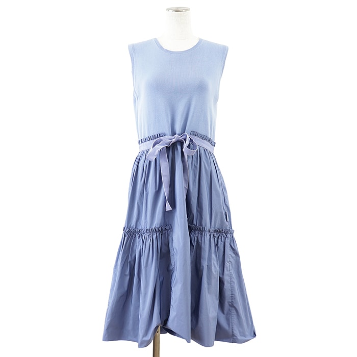 【SALE】MONCLER モンクレール ワンピース ノースリーブ サイズ S レディース ABITO クルーネック フリル ベルテッド コットンニット x ポリエステル コンビネーション ギャザー ドレス サックスブルー 青 トルコ製