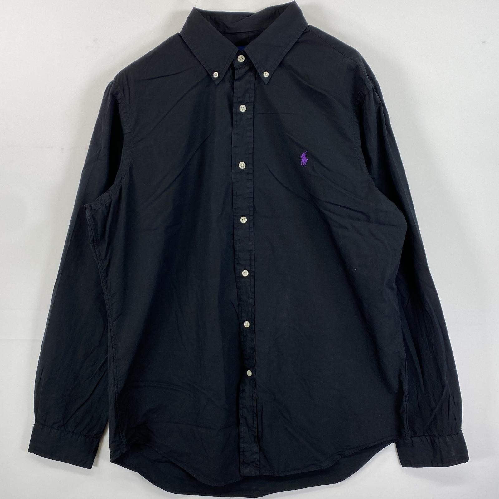 古着 ラルフローレン RALPH LAUREN 長袖シャツ ボタンダウン ロゴ刺繍 ワンポイントロゴ L ブラック 無地 メンズ