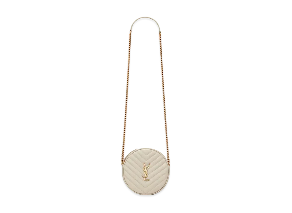 Saint Laurent Vinyle Round Camera Bag In Chevron-Quilted Grain De Poudre Embossed Leather "Vintage White"
