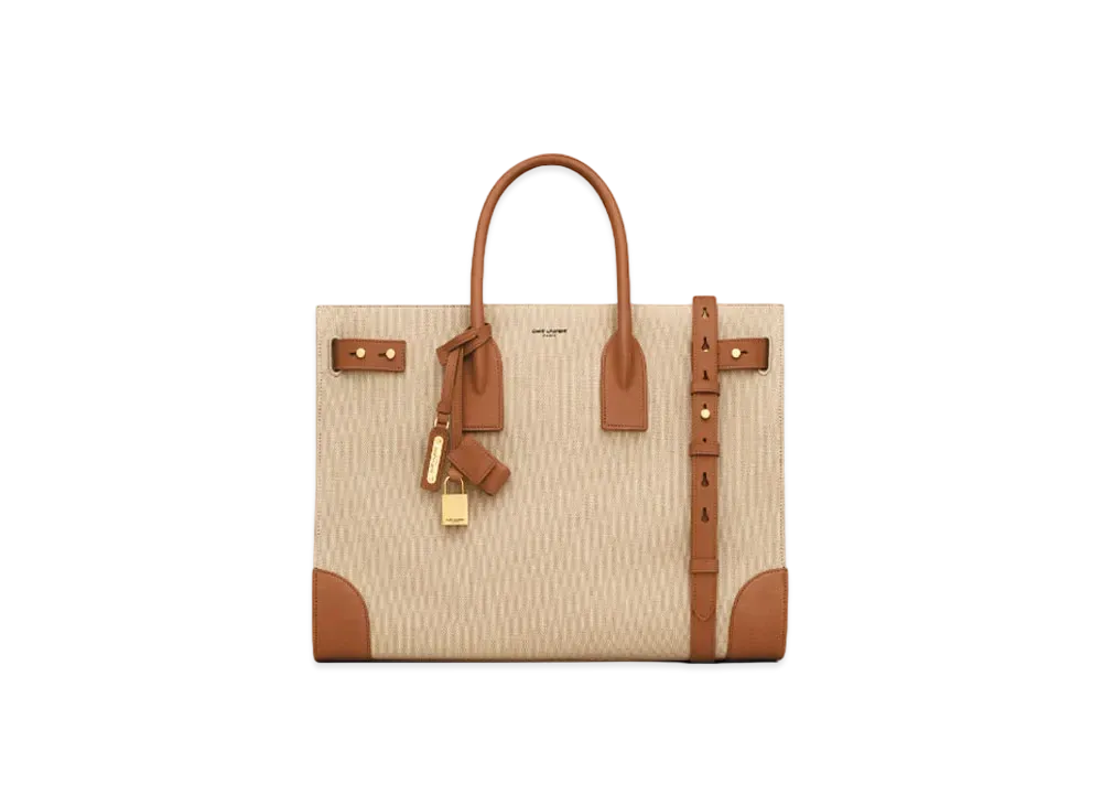 Saint Laurent Sac De Jour Thin Large in Canvas and Vegetable-Tanned Leather "Beige/Brick"