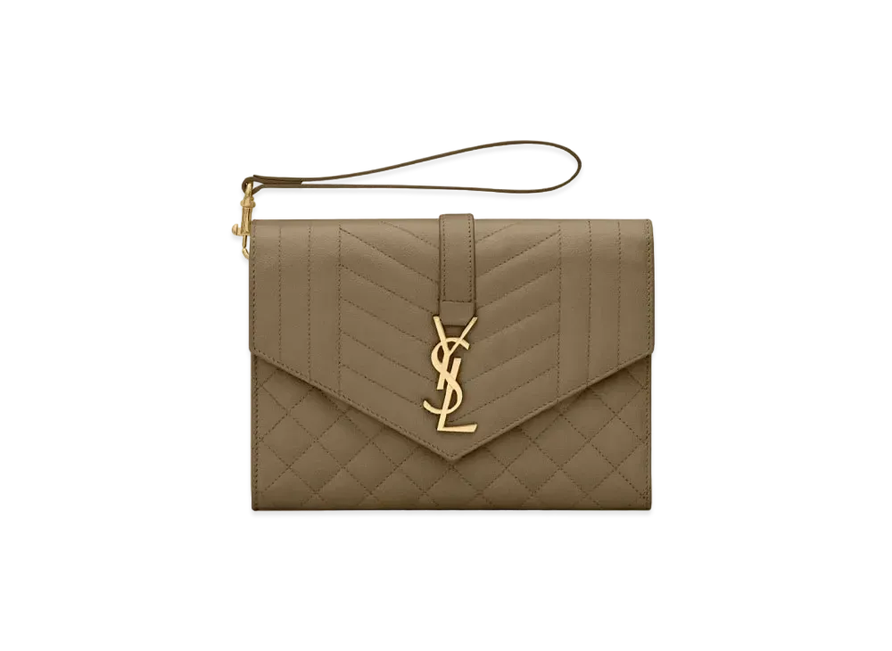 SAINT LAURENT Monogram Clutch In Mix Matelasse Grain De Poudre Embossed Leather "Khaki"