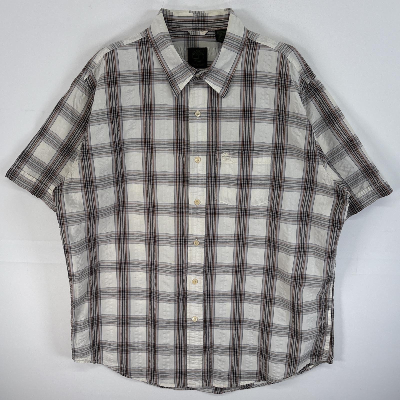 古着 ティンバーランド Timberland シアサッカー 半袖シャツ ロゴ 刺繍 チェック 胸ポケ 薄手 L ホワイト系 マルチカラー メンズ