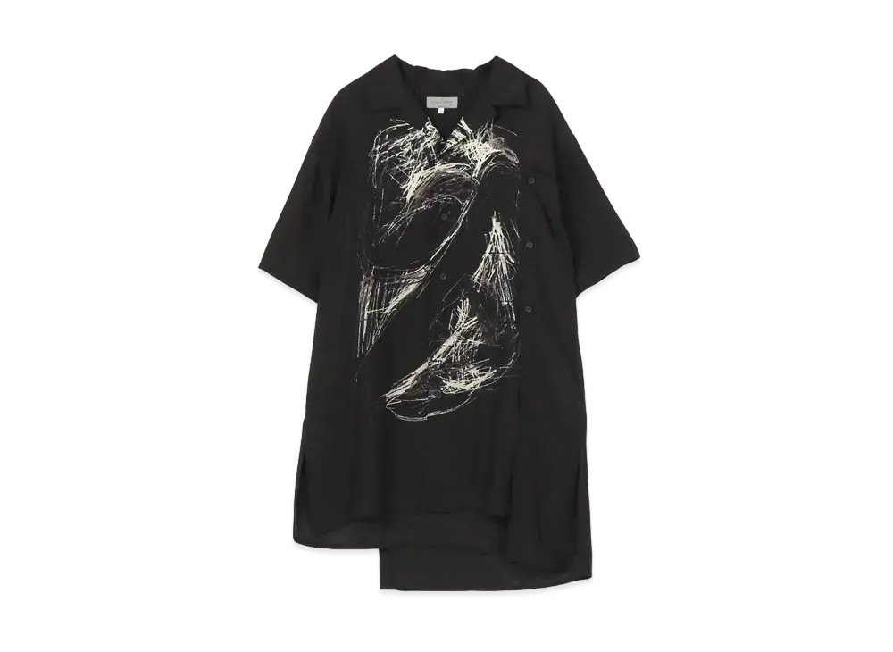 Yohji Yamamoto Pour Homme YUUKA ASAKURA SILK SATIN PRINT RIGHT BUTTON SWITCHING HALF SLEEVES ALOHA SHIRT "Black"