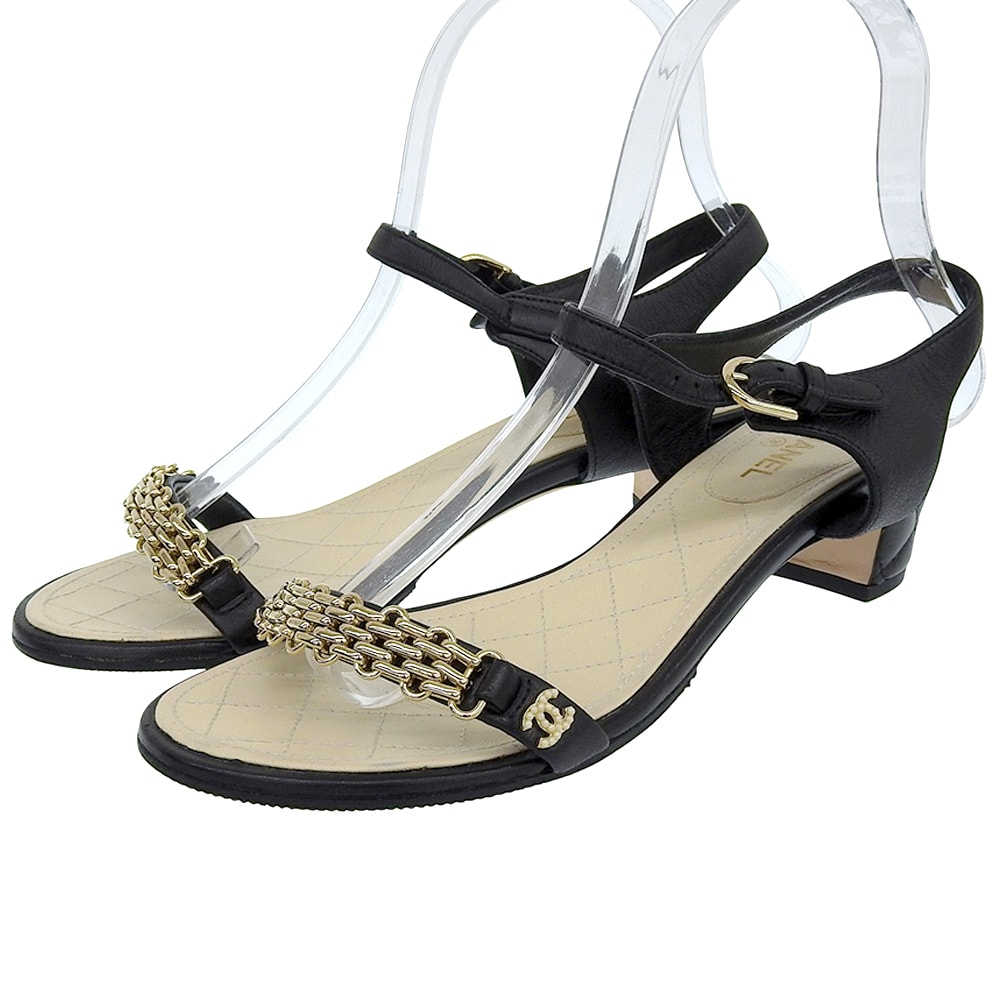 シャネル G金具 パールココマーク チェーンデザイン バックストラップヒールサンダル レディース ブラック×ベージュ 36 G31705 36