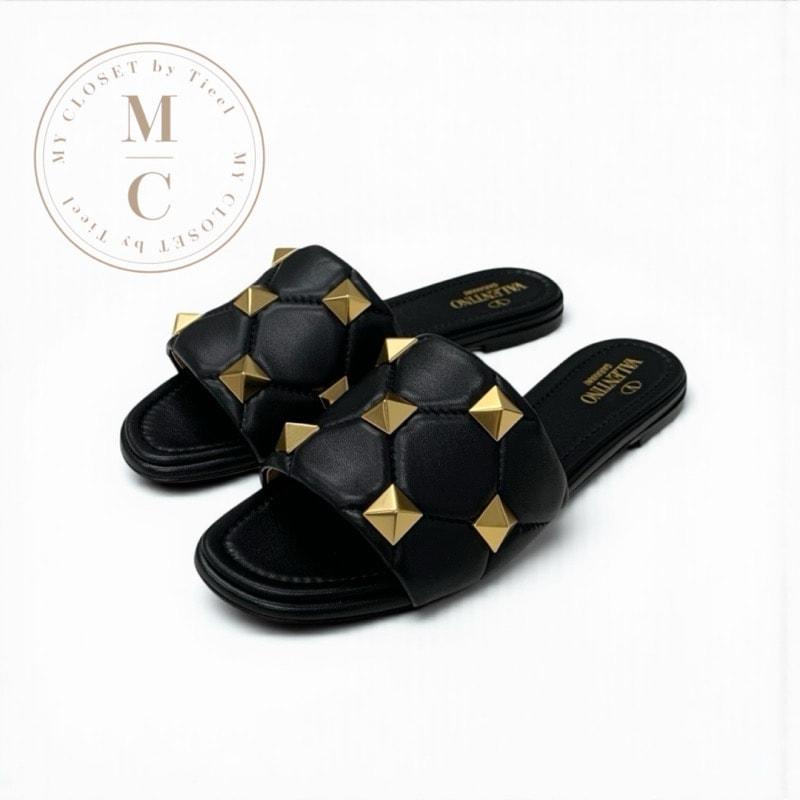 ヴァレンティノ VALENTINO サンダル 靴 シューズ レザー ブラック ゴールド 黒 未使用 ローマンスタッズ フラット ミュール