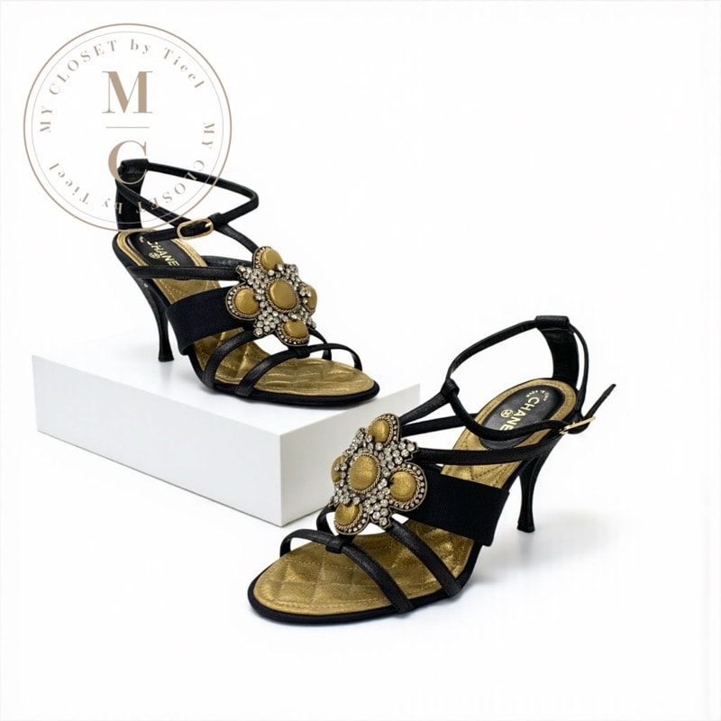 シャネル CHANEL サンダル 靴 シューズ レザー ブラック ゴールド ビジュー ストラップ
