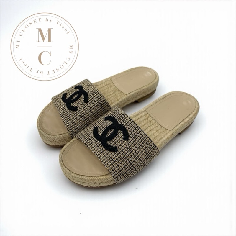 シャネル CHANEL サンダル 靴 シューズ ファブリック ベージュ ゴールド ブラック ココマーク