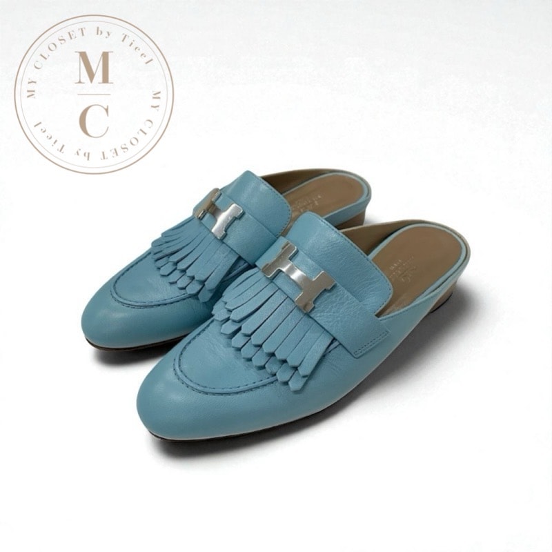 エルメス HERMES リヴォリ サンダル 靴 シューズ レザー ライトブルー シルバー H金具 コンスタンス フリンジ ミュール