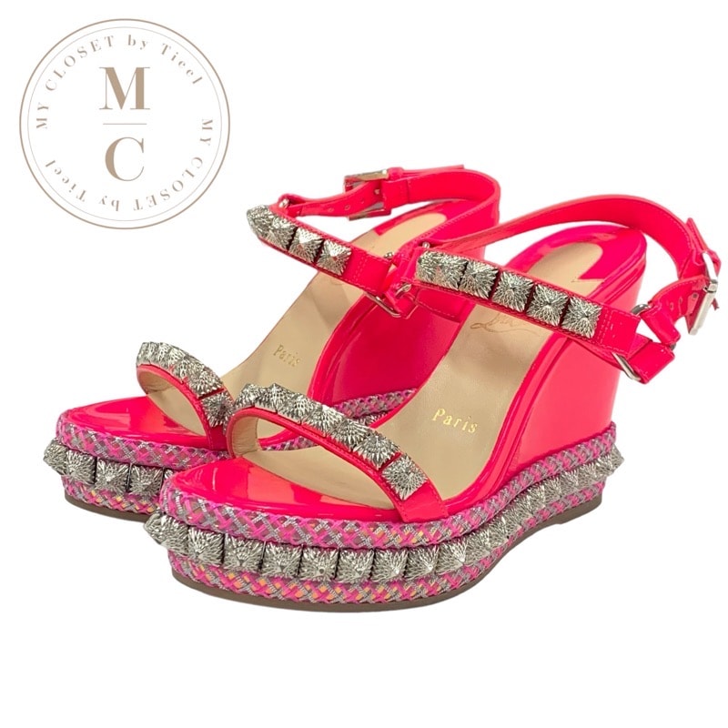 クリスチャンルブタン Christian Louboutin ピラリヤド サンダル 靴 シューズ パテントレザー ネオンピンク シルバー スタッズ ウェッジソール ピラクロウ