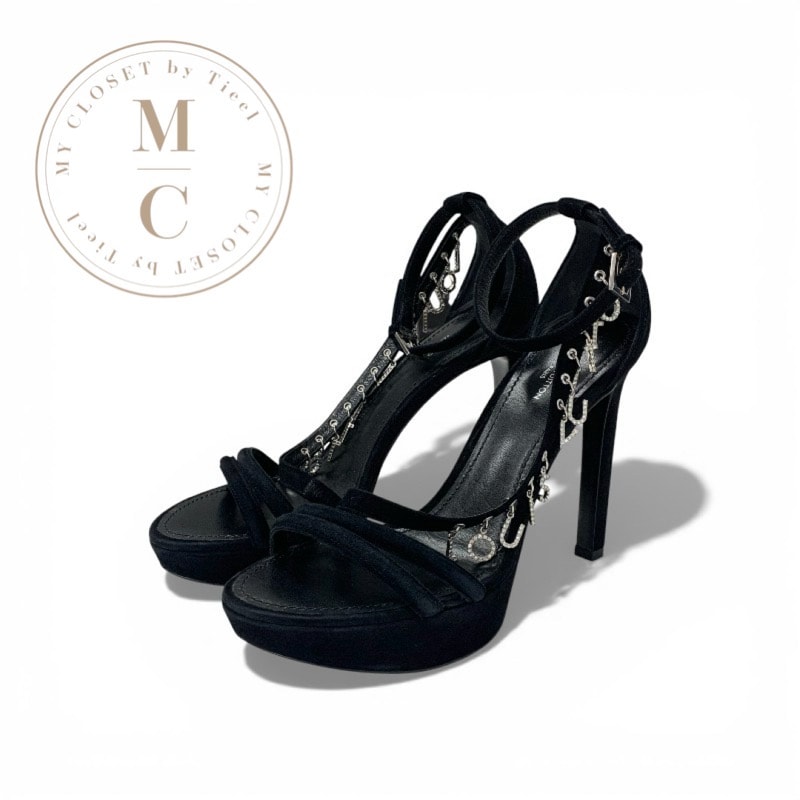 ルイヴィトン LOUIS VUITTON メロディライン サンダル 靴 シューズ スエード ブラック シルバー ロゴ チャーム ラインストーン ストラップ