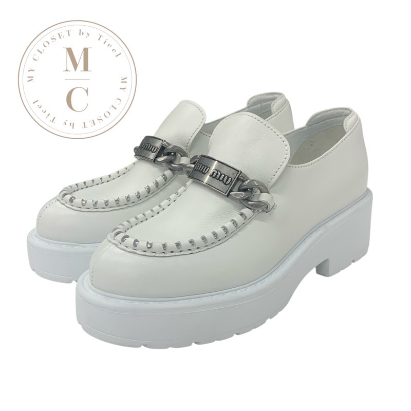 ミュウミュウ MIUMIU ローファー 革靴 靴 シューズ レザー ホワイト 白 シルバー ロゴ プレート チェーン プラットフォーム 厚底
