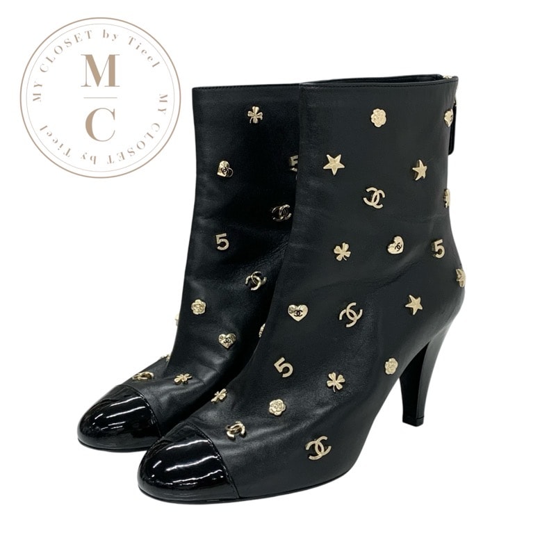 シャネル CHANEL ブーツ ショートブーツ 靴 シューズ レザー パテント ブラック ゴールド ココマーク アイコン ロゴ