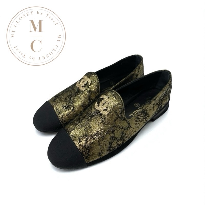 シャネル CHANEL ローファー 革靴 靴 シューズ スエード レザー ファブリック ブラック ゴールド ココマーク