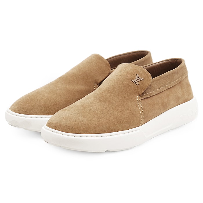 【美品】LOUIS VUITTON ルイ・ヴィトン パシフィックラインローファー スウェード シグネチャー ロゴ LV チャーム スリッポン シューズ 革靴 メンズ サイズ 9.5 ブラウン ホワイト 茶 白 イタリア製