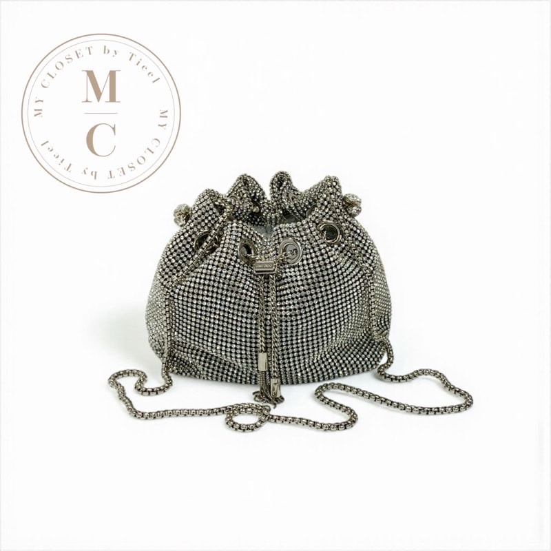 ジミーチュウ JIMMY CHOO ボンボン バッグ ショルダーバッグ シルバー ラインストーン 巾着 チェーン 2WAY ハンドバッグ パーティーバッグ