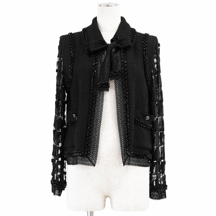 シャネル 2009年製 ツイード レース チュールスリーブ ビジュー ジャケット レディース ブラック 40 CHANEL