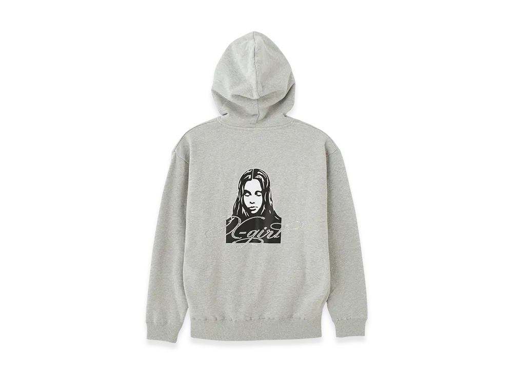 X-Girl Rhinestone Logo And Face Zip Up Sweat Hoodie "Grey"