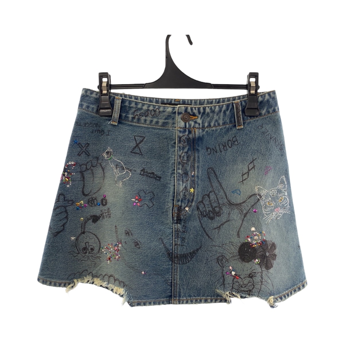 美品 BALENCIAGA バレンシアガ グラフィック プリント ラインストーン サイズ36 ブルー マルチカラー シルバー金具 デニム ミニスカート 503758 【中古】