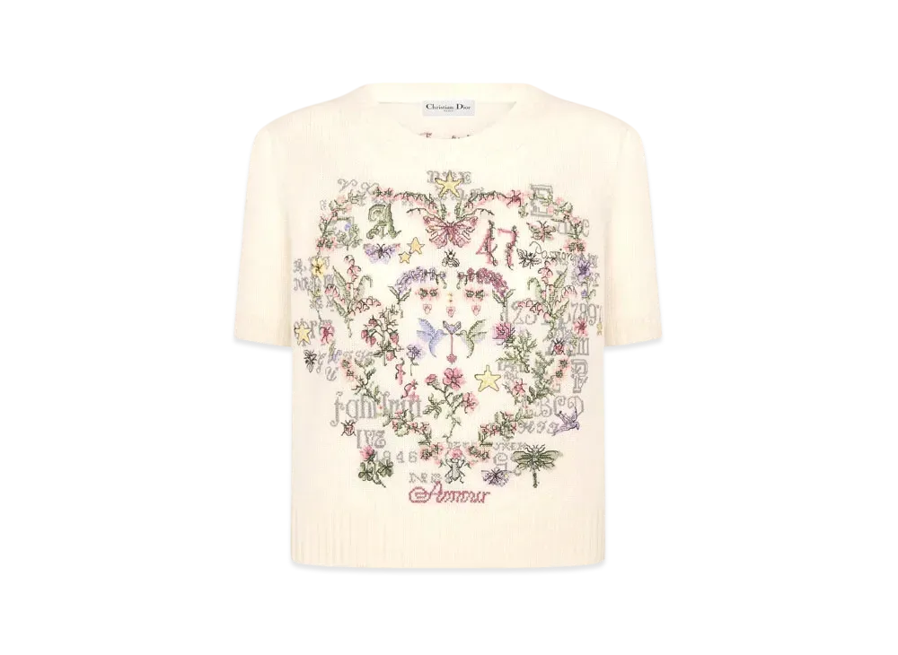 Dior Dioramour Short-Sleeved Embroidered Sweater Cashmere Knit with Amour 1947 Motif "Ecru/Multicolor"