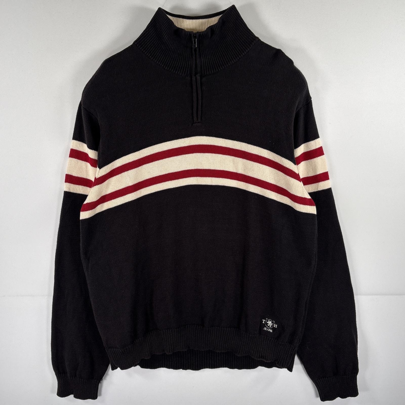 古着 トミーヒルフィガー TOMMY HILFIGER コットンニットセーター ハーフジップ ボーダー リブ襟 裾ワンポイント刺繍 大きいサイズ 14041 ブラック メンズ