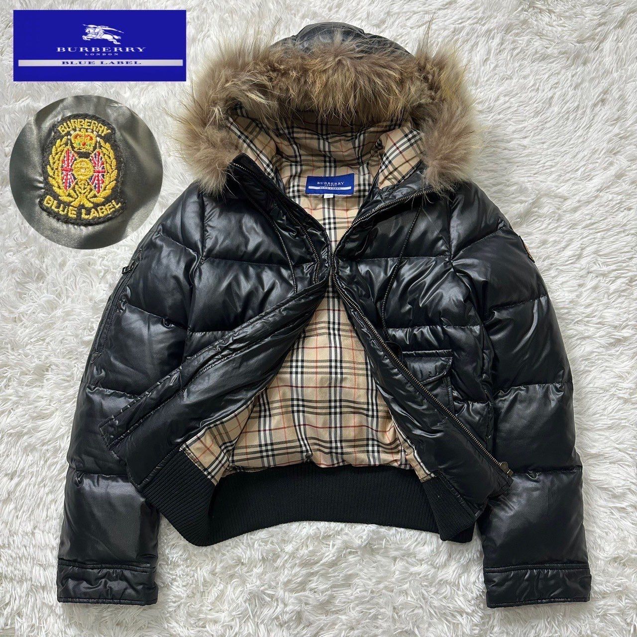 バーバリーブルーレーベル ダウンジャケット 黒 光沢 ワッペン M