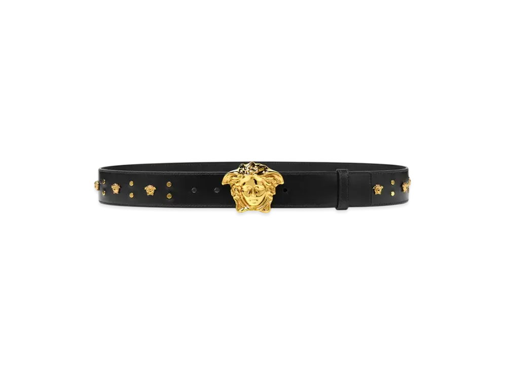 Versace Studded Medusa Leather Belt 1.6" "Black/Gold"