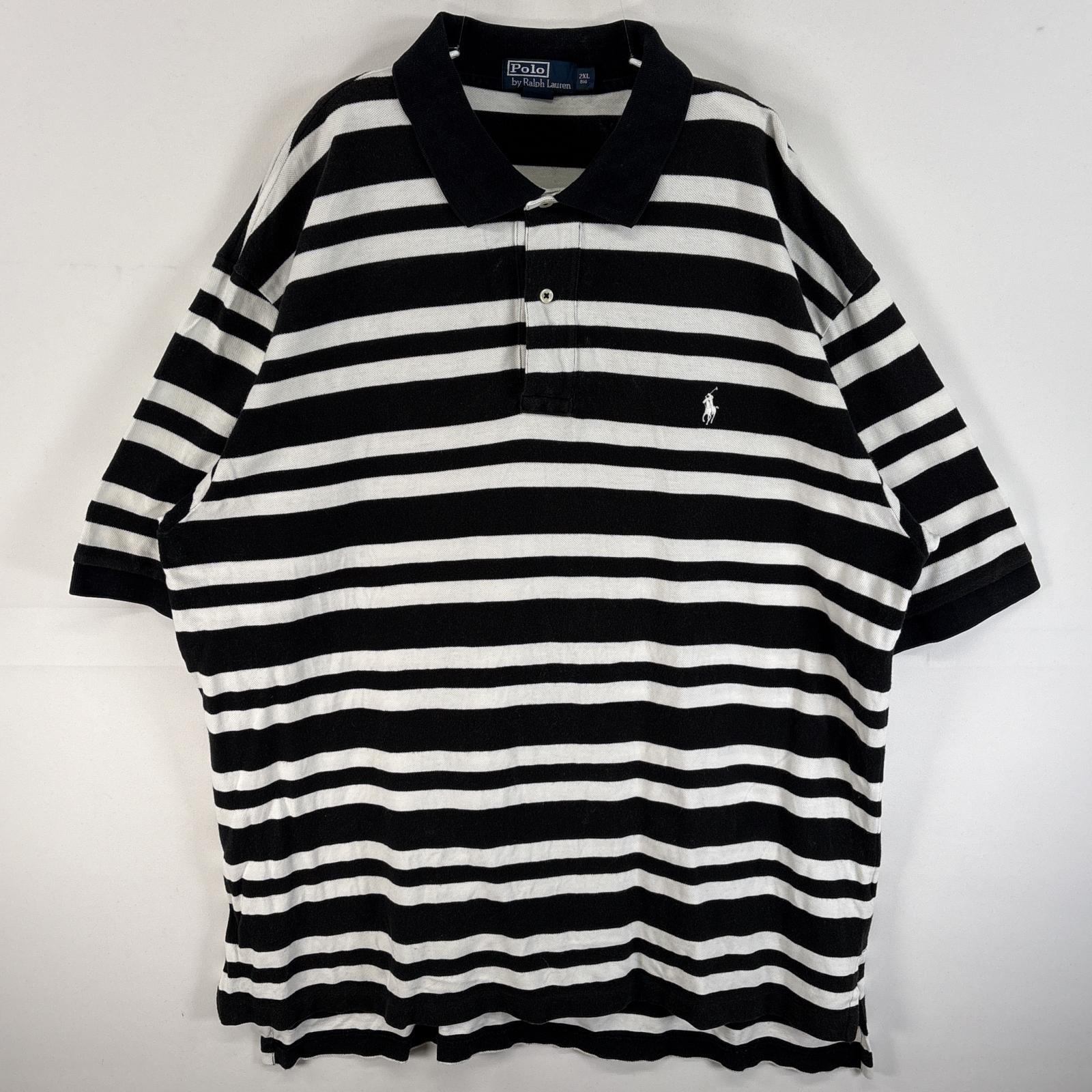 古着 90's/90年代 ポロバイラルフローレン Polo by Ralph Lauren 鹿の子 半袖 ポロシャツ ワンポイント ロゴ 刺繍 2ボタン 大きいサイズ 2XL BIG ブラック系 ボーダー メンズ