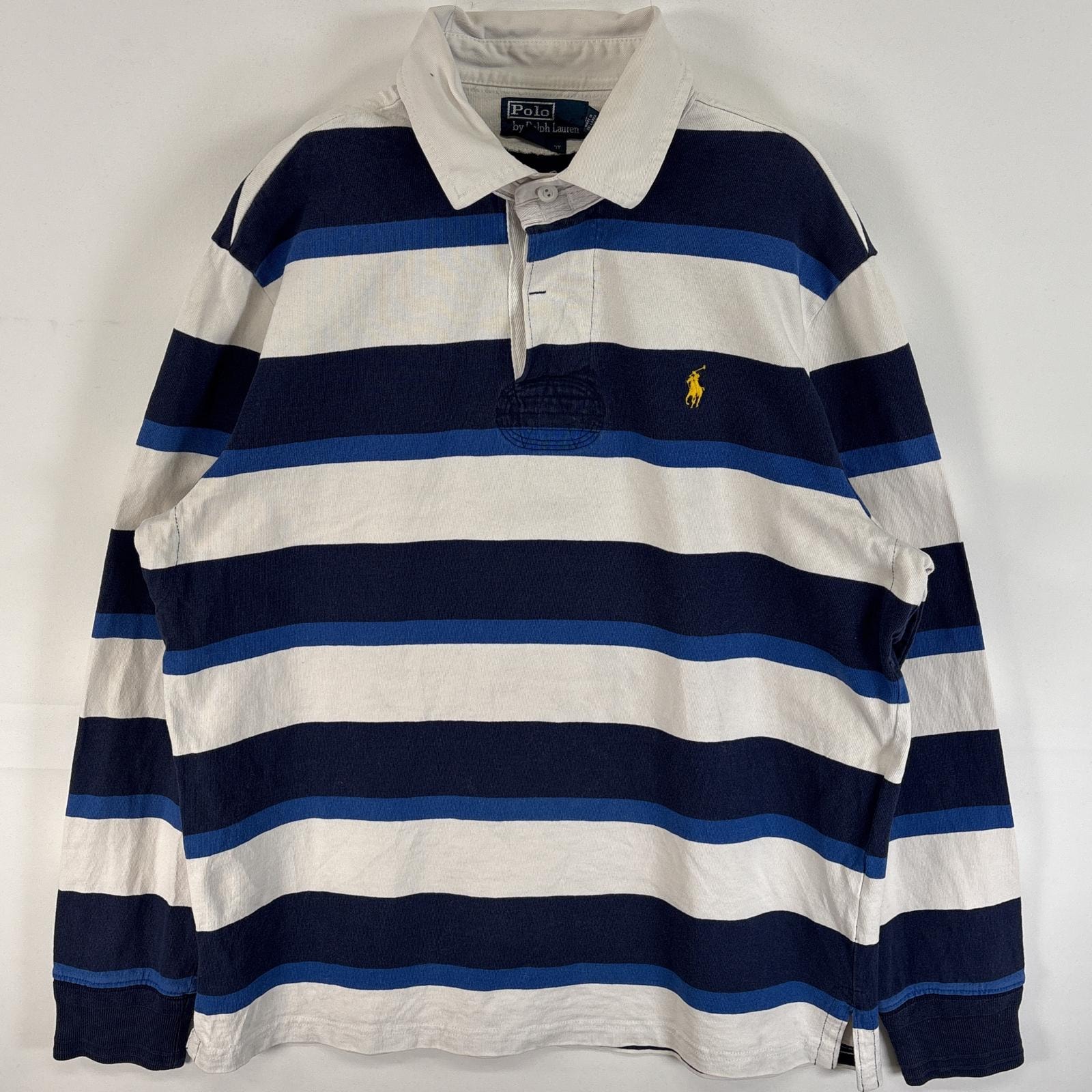 古着 90's/90年代 ポロバイラルフローレン Polo by Ralph Lauren 長袖 ラガーシャツ ワンポイント ロゴ 刺繍 ボーダー CUSTOM FIT L ブルー系 マルチカラー メンズ