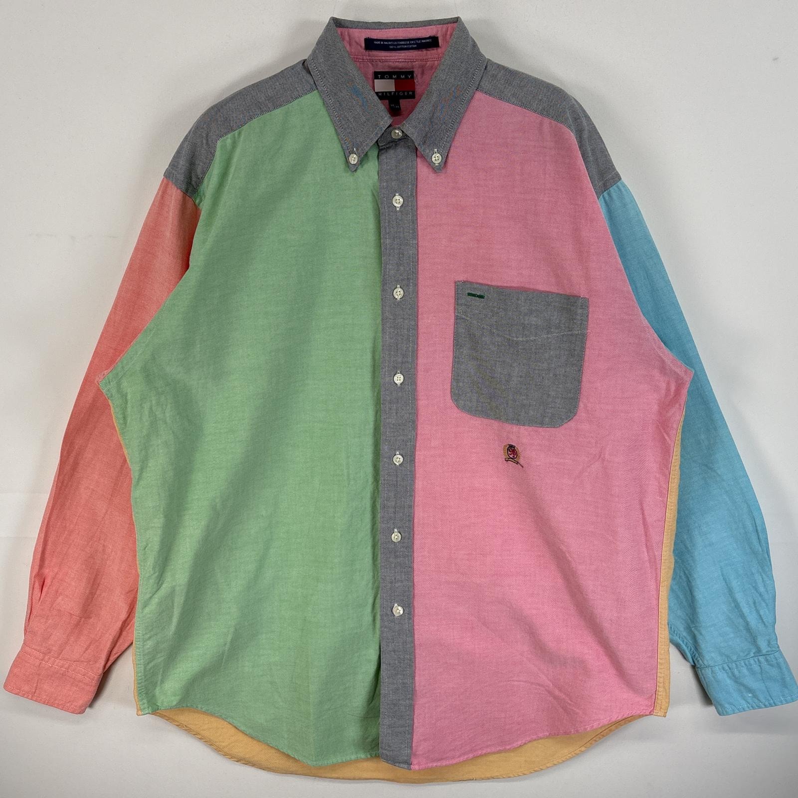 古着 90's/90年代 トミーヒルフィガー TOMMY HILFIGER 長袖シャツ クレイジーパターン ワンポイント ロゴ 刺繍 フラッグタグ M グリーン系 マルチカラー メンズ