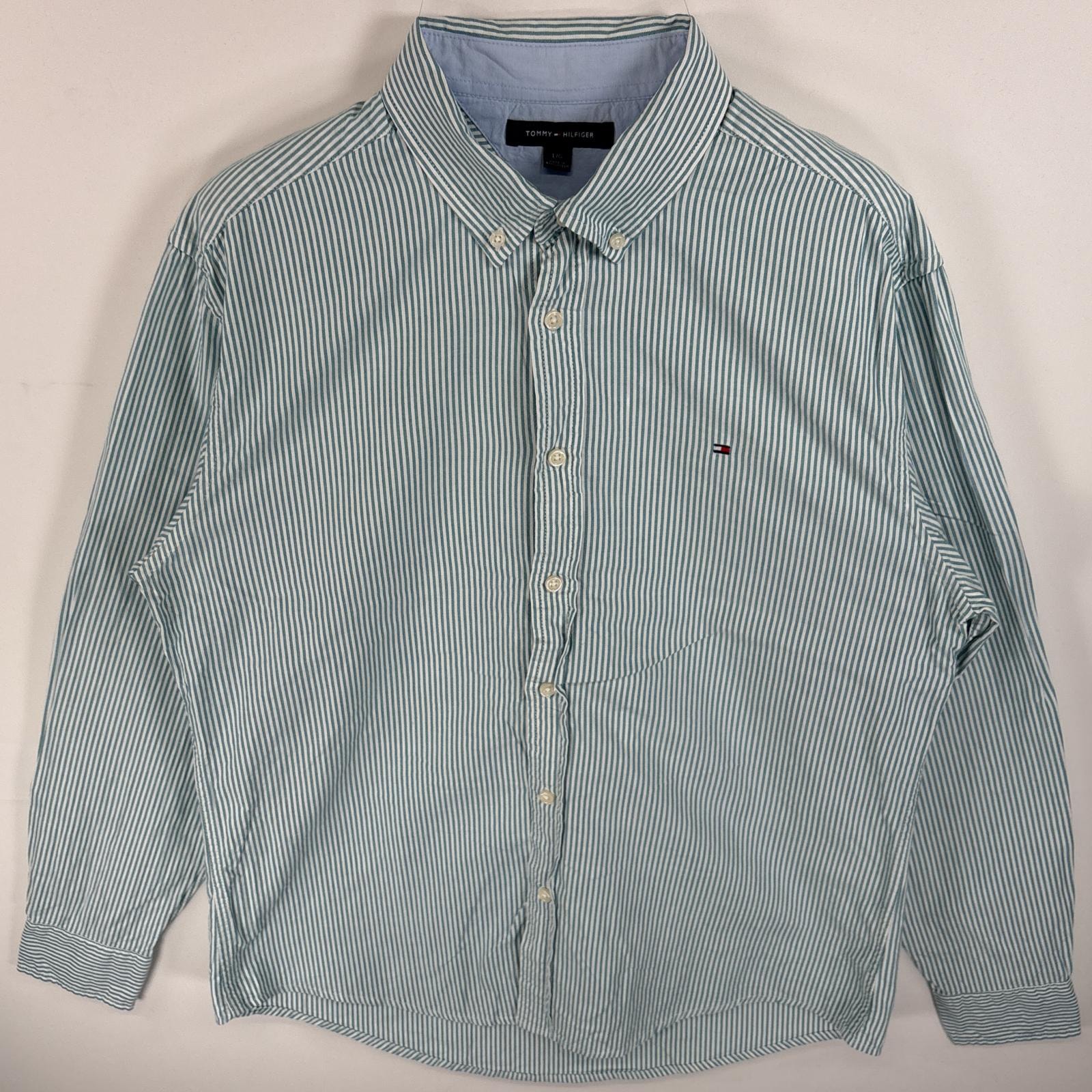 古着 トミーヒルフィガー TOMMY HILFIGER 長袖シャツ ボタンダウンシャツ ワンポイント 刺繍 ロゴ L グリーン系 ストライプ メンズ