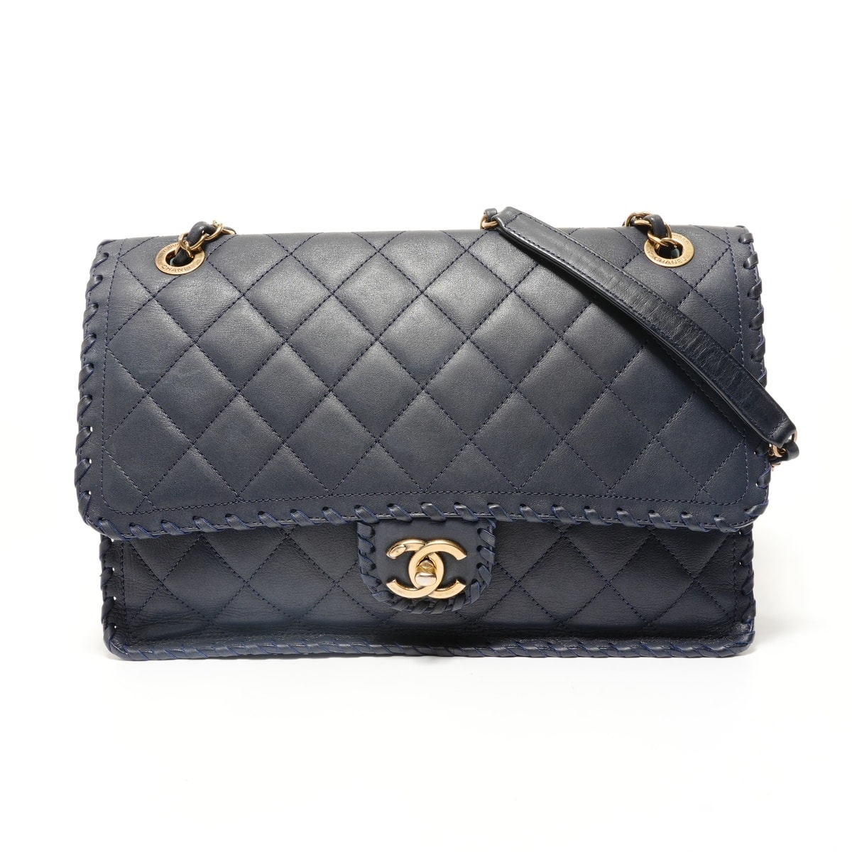 シャネル 10番 ネイビー インディゴ スパークリングデニム ゴールド金具 マトラッセ ダブルチェーンショルダーバッグ W25