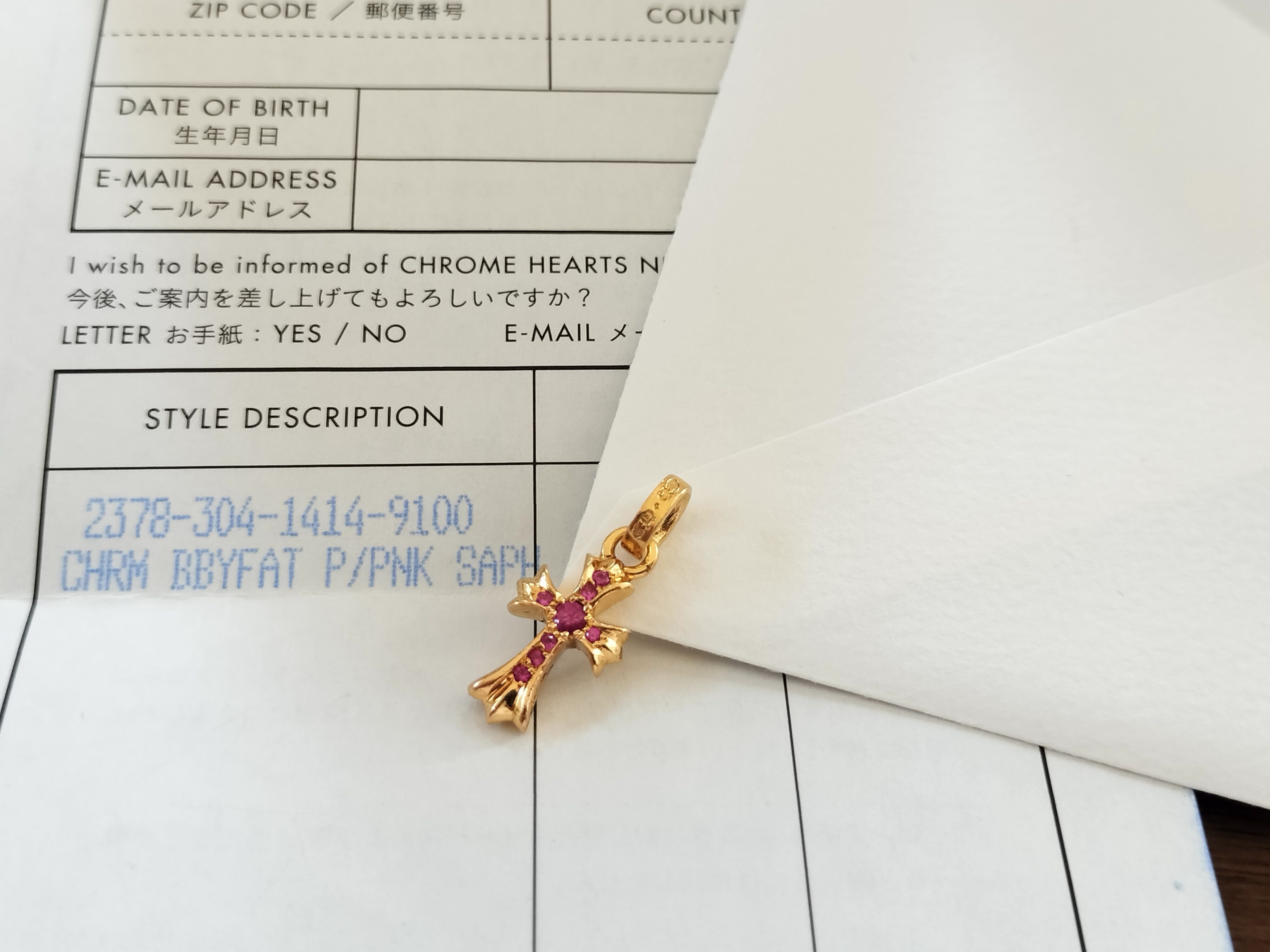 Chrome Hearts 22K CH Cross Baby Fat Charm with Pave Pink Sapphire "Yellow Gold"