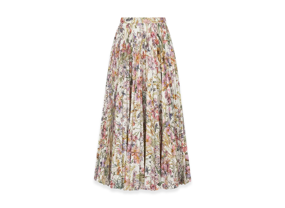 Dior Women's Mid-Length Pleated Skirt Silk Poplin 4 Saisons Ete Motif "White/Multicolor"