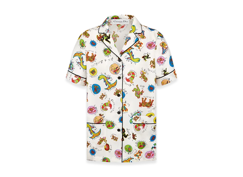 Dior Women's Short-Sleeved Shirt Silk Twill Dragon Zodiac Motif "White/Multicolor"