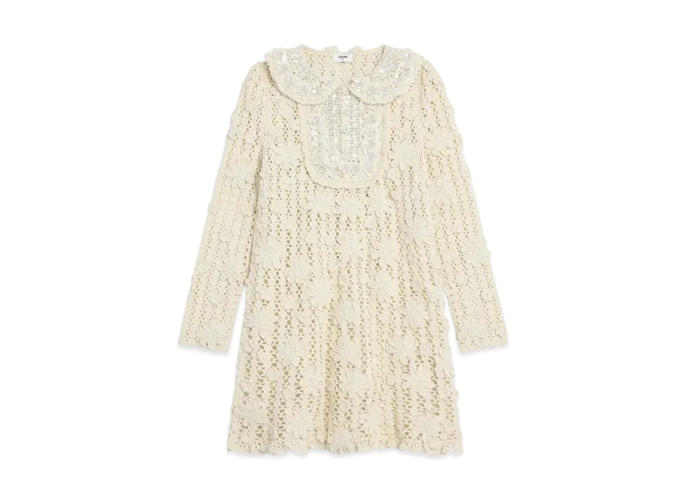 CELINE Women's Embroidered Mini Dress in Crocheted Cotton "Off White"