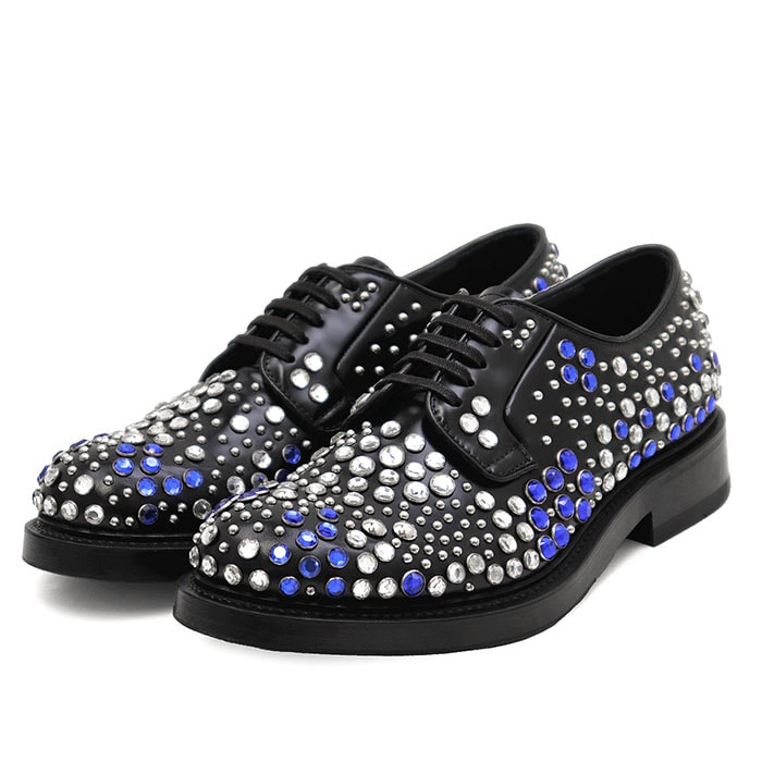 【未使用】PRADA プラダ ドレスシューズ レザー ラインストーン/スタッズ プレーントゥ エッグトゥ ダービー 外羽根 チャンキーソール 厚底 革靴 箱・袋付属 メンズ サイズ 5 ブラック シルバー ブルー 黒 銀色 青 イタリア製 2EA151