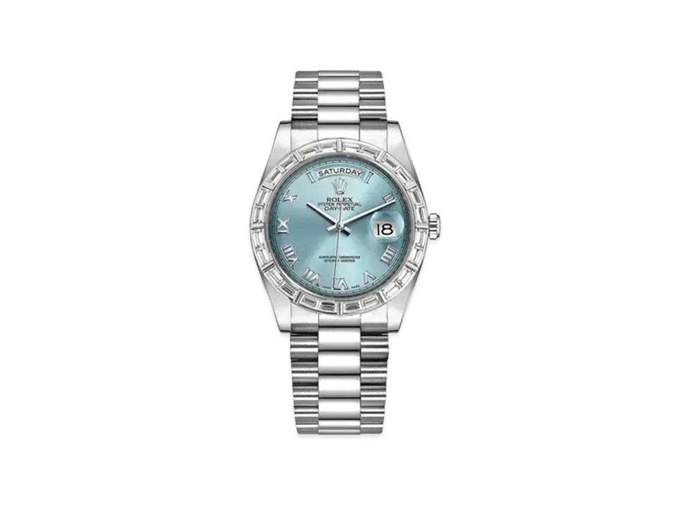 ROLEX Day-Date 36mm Oyster Perpetual Baguette-Cut Diamonds Bezel "Ice Blue/Roma" 118366