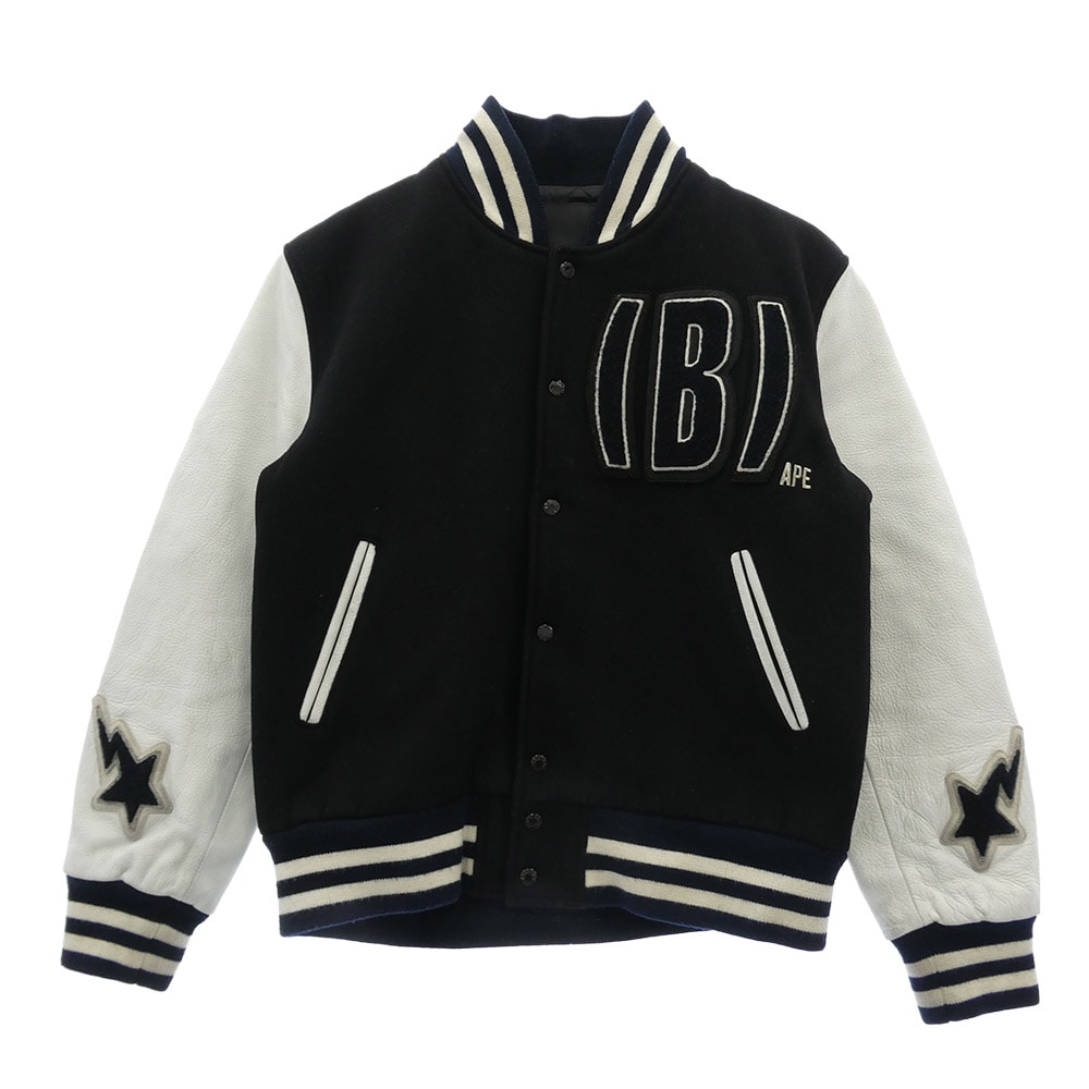 A BATHING APE アベイシングエイプ スタジャン Cowhide Varsity jacket 牛革 袖 レザー BAPSTA B ワッペン スタジャン バーシティジャケット ブラック ブラック系 L【中古】