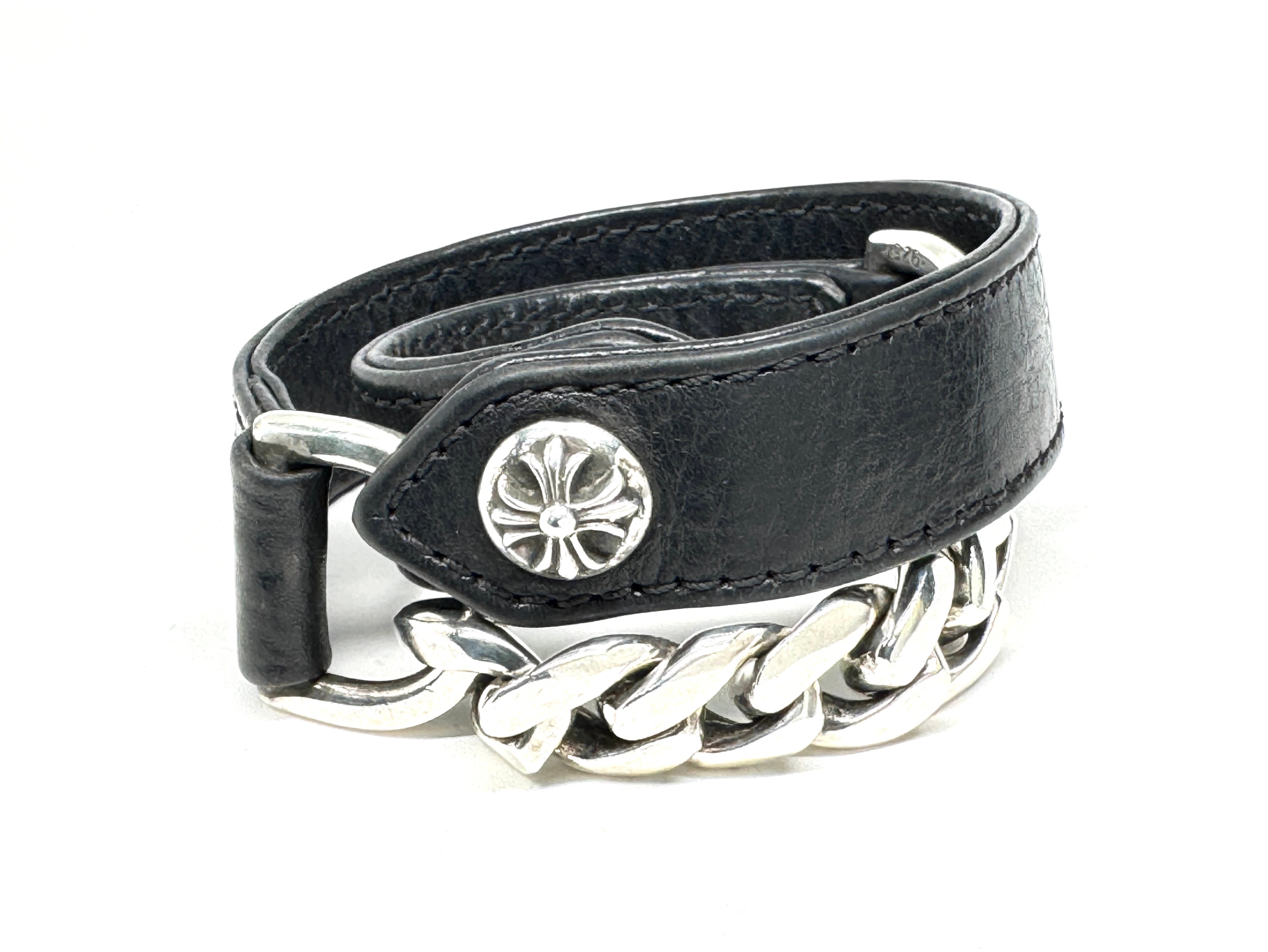 Chrome Hearts 1 Button 1 Snap Double Chain Leather Bracelet "Black/Silver"