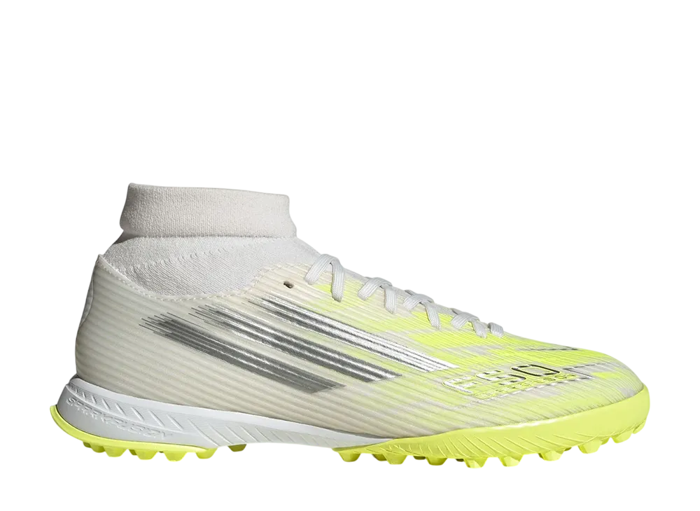adidas Women's F50 Sparkfusion League Mid Cut TF Cleats "Cloud White/Iron Metallic/Hi-Res Yellow"