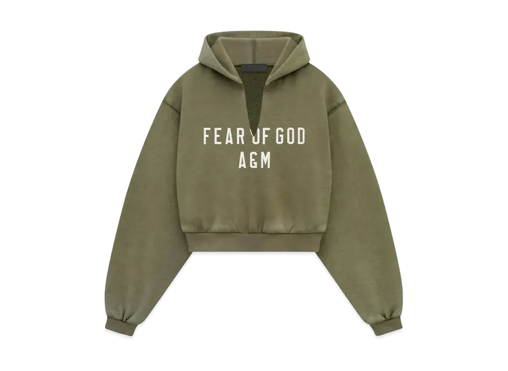 FEAR OF GOD Essentials Womens Heavy Fleece Cropped V-Neck Hoodie "Military"