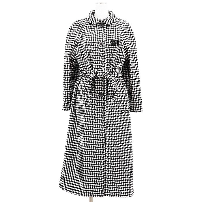【極美品】Miu Miu ミュウミュウ コート 2022年製 ハウンドトゥース 千鳥格子 総柄 モノトーン バージンウール100% メルトン バルマカーン ステンカラー ロゴ パッチ 一重仕立て アウター ベルト付属 レディース 36 黒 白 イタリア製