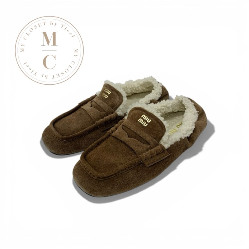 ミュウミュウ MIUMIU ローファー 革靴 靴 シューズ スエード ムートン ブラウン ロゴ バレエシューズ フラットシューズ